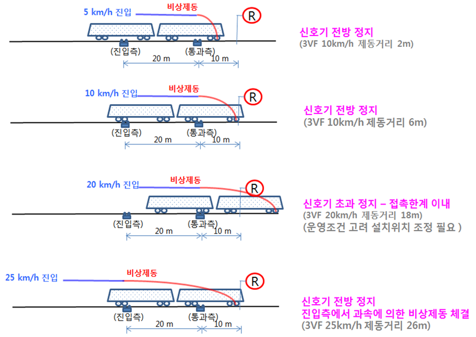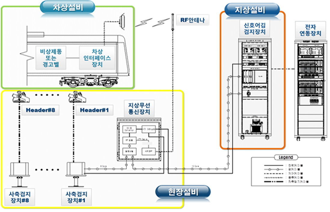 차량기지에서 기관사가 책임모드로 운전하던 중 정지 신호를 모진하여 진입할 경우, 신호 어김 발생을 기관사에게 경고하는 동시에 비상 제동을 체결하고, 나아가 주변의 열차까지도 정지시킴으로써 2차 사고를 미연에 방지하여 안전을 강화하는 시스템입니다.