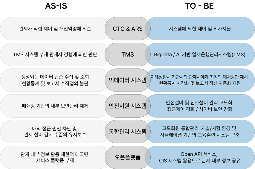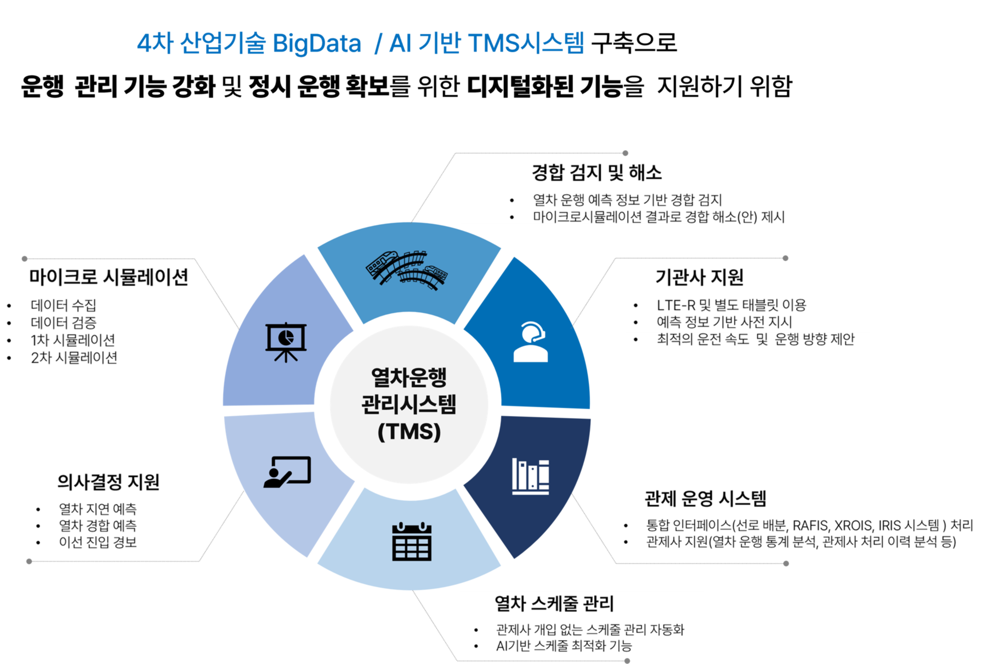 Big Data수집 및 분석, 각 종 연계 데이터 관리, 현황통계 시각화, 보고서 작성, 열차운행관리 지원 등 관제업무 자동화를 위한 인공지능 서비스 구축