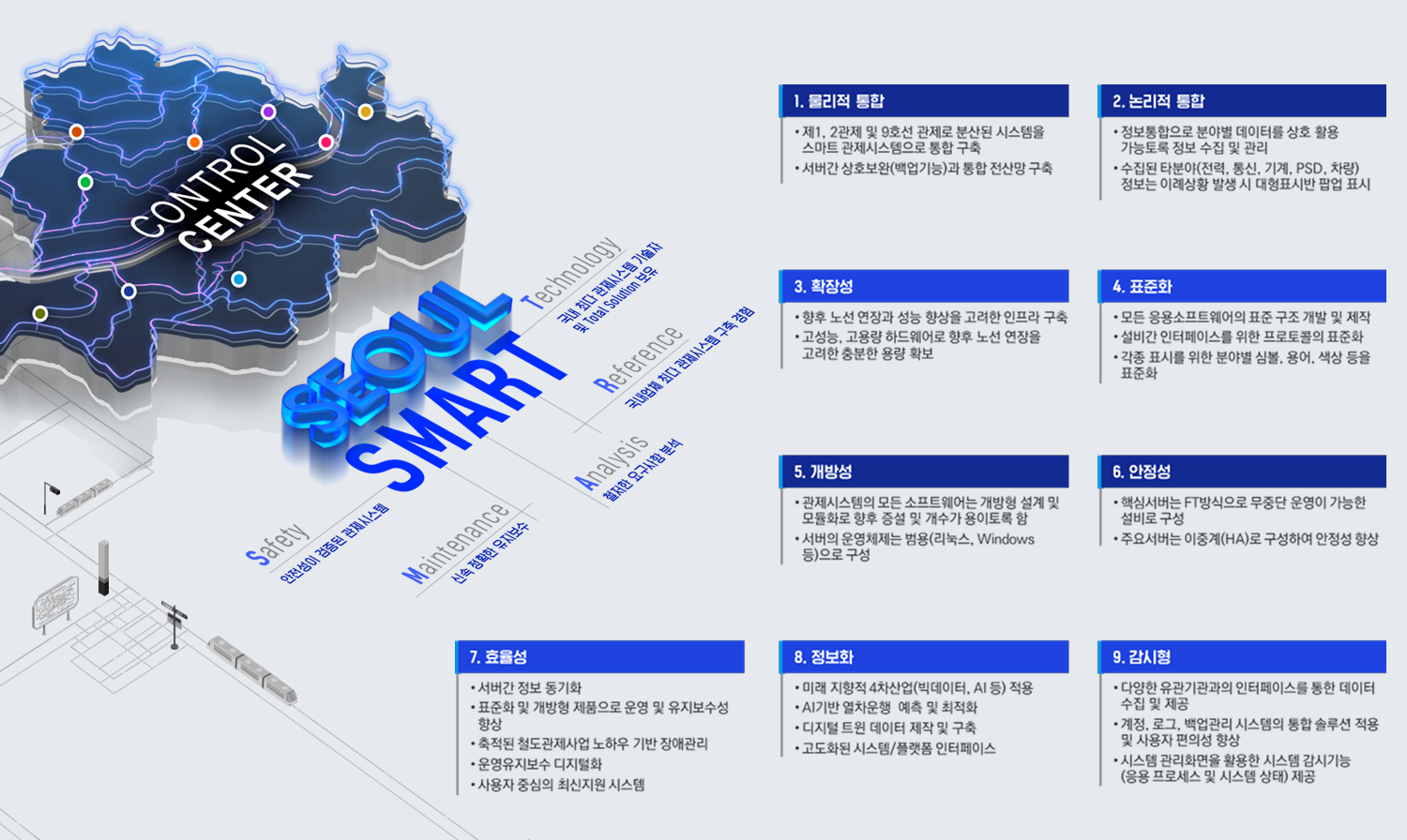도시철도 운영의 효율성, 안전성, 실시간성, 자동화를 향상시키기 위해 정보통신기술(ICT), 사물인터넷(IoT), 인공지능(AI) 등을 활용하여 열차 운행, 설비 상태, 승객 정보 등을 통합적으로 모니터링하고 제어하는 지능형 관제 시스템입니다.