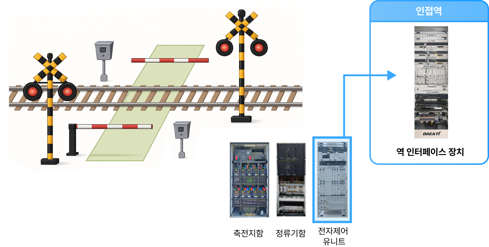 철도와 도로가 교차하는 철도 건널목에 설치되는 안전설비인 차단기,경보기,운영 상태 정보를 통합제어하고, 역 인터페이스 장치와 인터페이스하여 건널목 운용 및 고장 상태를 전송하여 운용자에게 고장 및 각종 상태정보를 제공합니다.