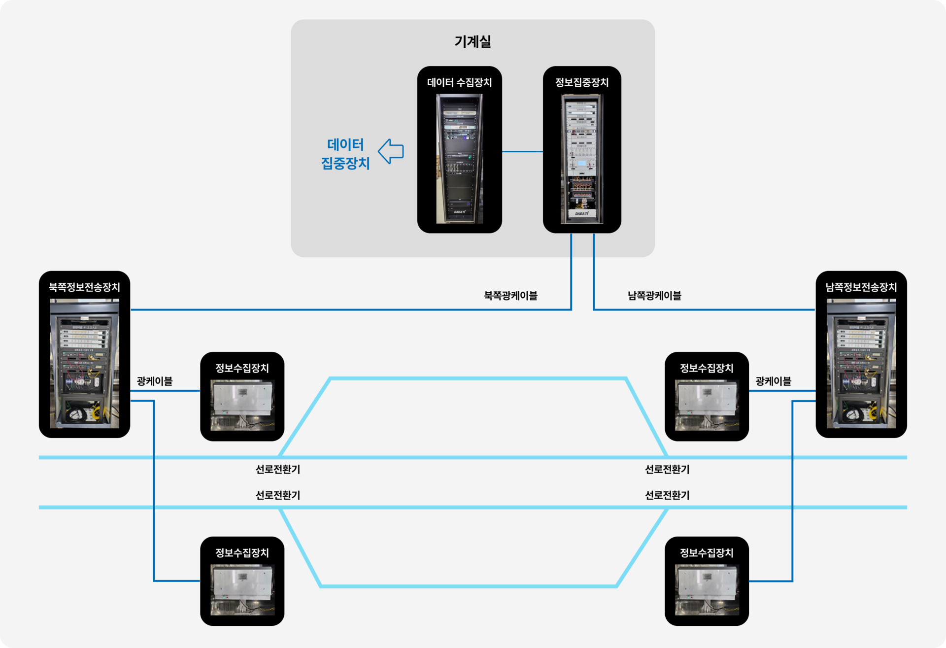 선로전환기 감시장치는 선로전환기에 대한 실시간 동작상태 감시 및 표시, 전원회로 및 밀착검지기의 상태를 감시/측정하고 전기설비기술지원시스템과 인터페이스하여 각종 검측 상태를 사용자에게 알려주고, 이를 분석하여 유지보수에 활용할 수 있게 하는 장치입니다.