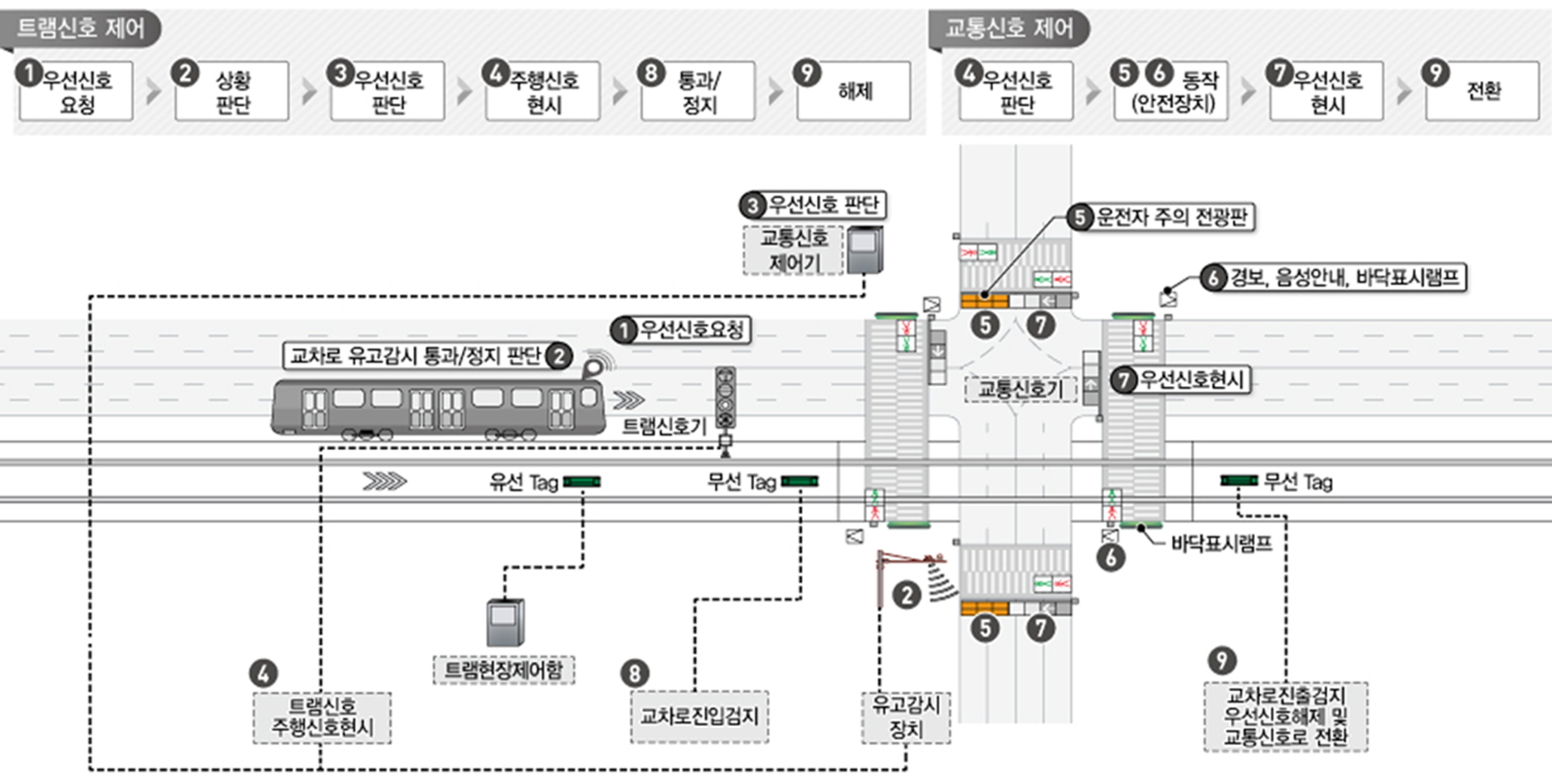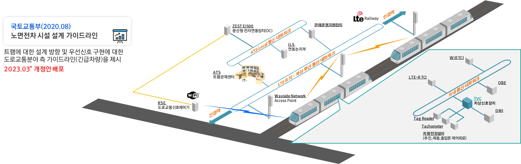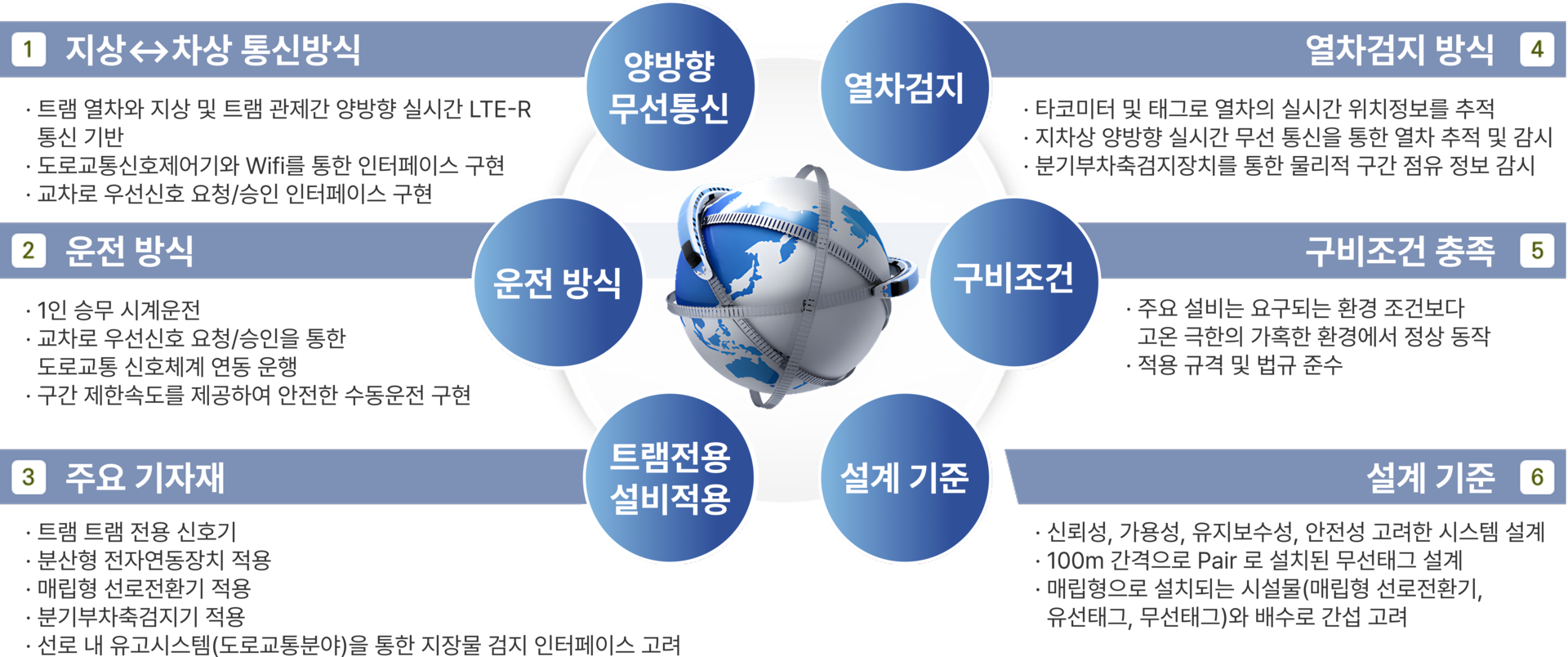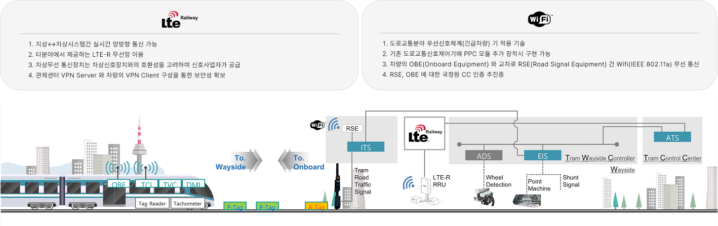 지상의 태그와 차상의 속도센서를 이용하여 CBTC 와 유사한 원리로 트램의 위치 검지를 수행하며 관제센터 및 도로교통신호체계와의 무선통신을 위하여 LTE-R과 Wifi 두가지 방식의 인터페이스를 모두 수용하며 다양한 보안정책과 네트워크 설계 기법이 적용됩니다.