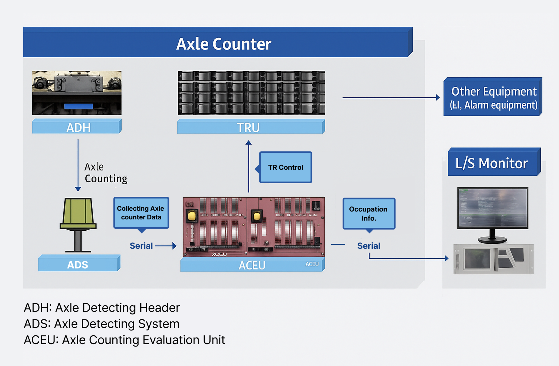 차축검지장치는 선로의 특정지점을 통과하는 차축의 수를 계산하는 방법으로 열차의 위치를 추척하는 장치입니다. 다양한 열차 운행 구간과 검수고, 역 구내, 단선이나 복선에 상관없이 사용할 수 있고, 광 링 네트워크 통신망으로 구성되며 날씨나 선로 상태에 영향을 받지 않습니다.