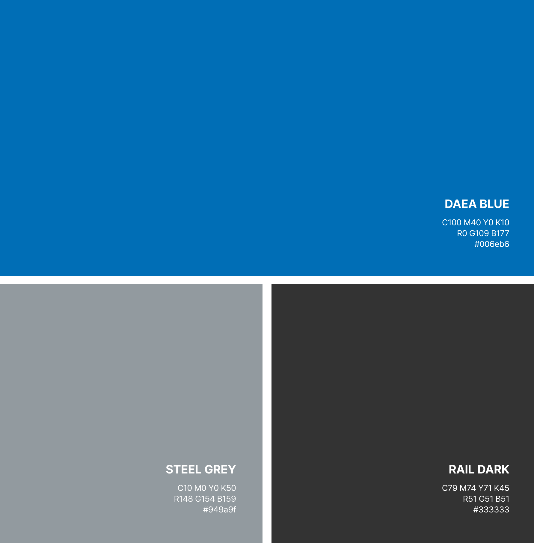 Sub Color인 Steel Grey와 Rail Dark는 철도기술의 소프트웨어와 하드웨어를 상징합니다.